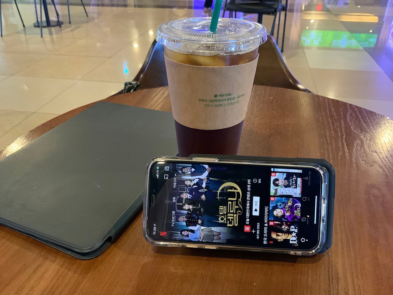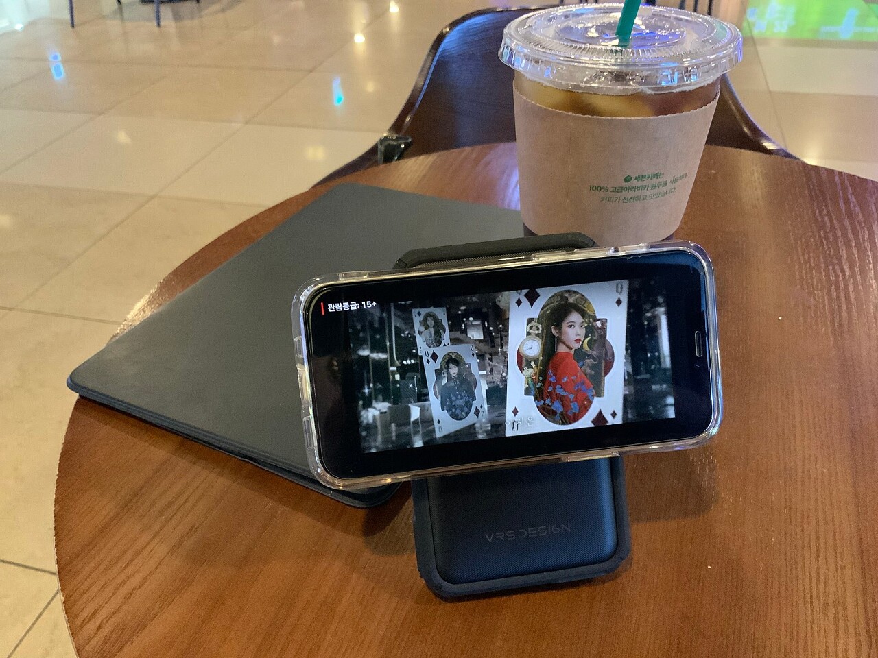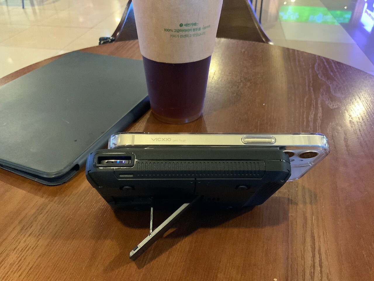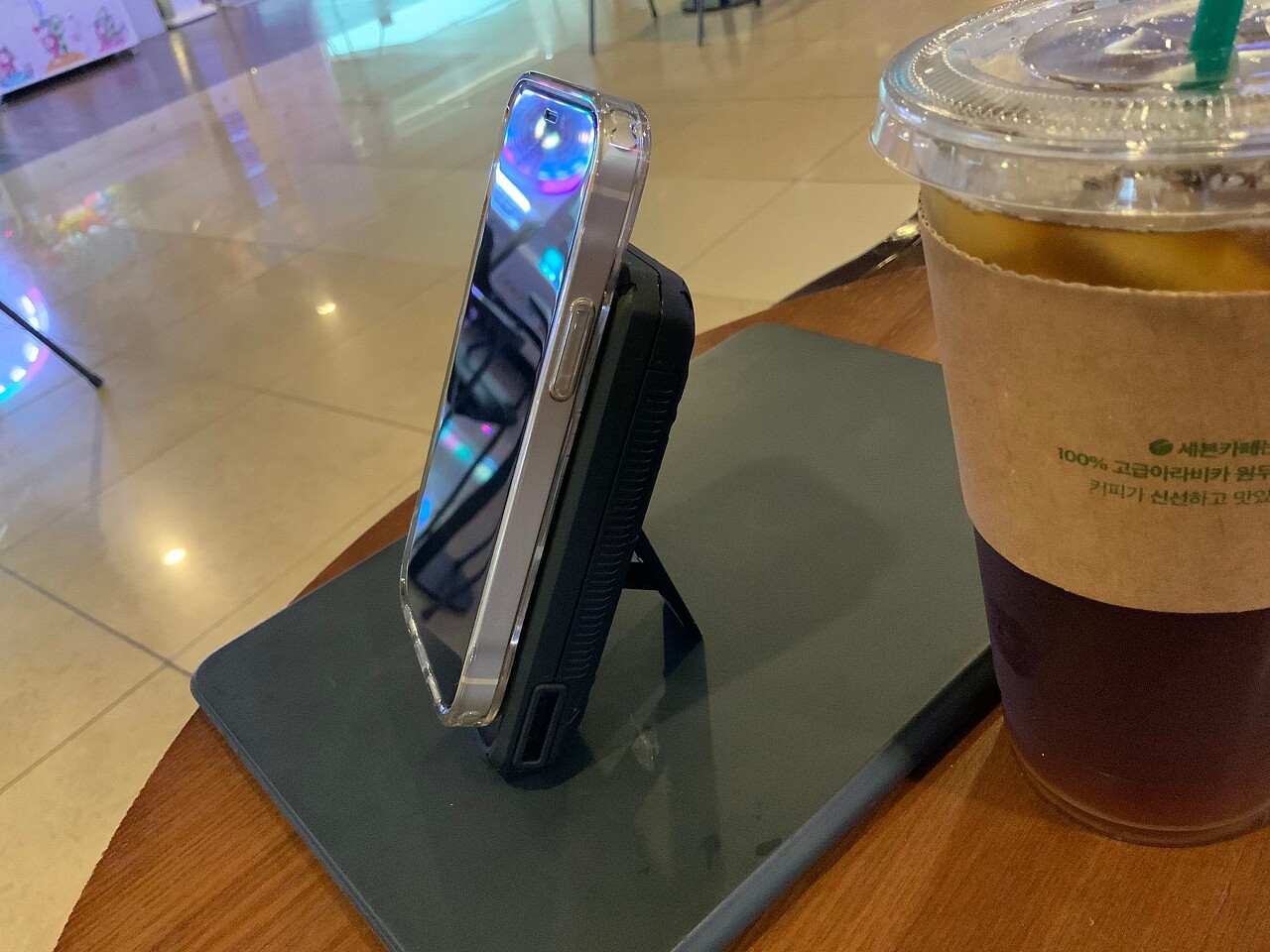 샹치 텐링즈의 전설을 보러 외출하면서 헤일로프로 맥세이프 보조배터리 사용을 해보고자 들고 나왔습니다. 그런데 영화시간보다 일찍 나왔네요.^^;;; 커피를 주문하고 남은시간 웹툰이나 넷플릭스 시청을 위해 해일로프로 보조배터리를 충전거치해보았습니다.