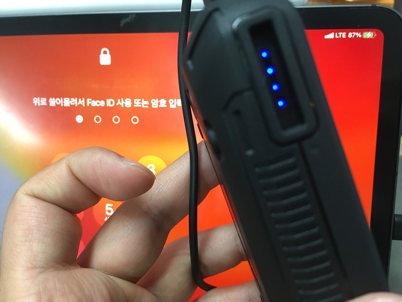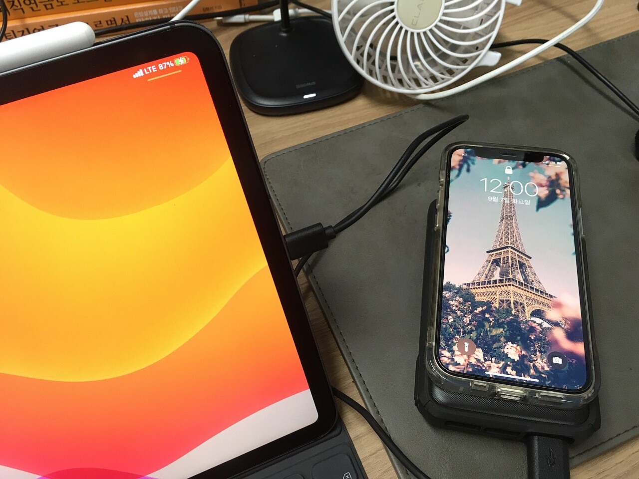 아이패드 뿐 아니라 USB포트에 애플워치 휴대용 충전기를 연결해서 충전해보았는데요. 충전이 잘되네요. 아이폰12 미니가 무선충전중에 포트에 연결해 충전했는데 둘다 동시에 충전이 잘 되고있습니다.